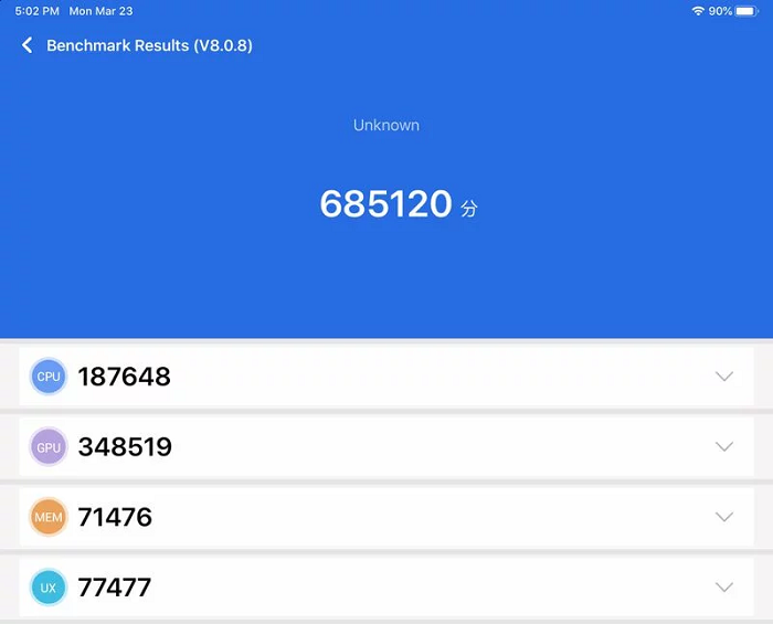 最终 2020 款 iPad Pro 的 CPU 得分为 187648、GPU 348519、内存 71476,而 2018 款则是 CPU 184553、GPU 357335、内存 90598 。