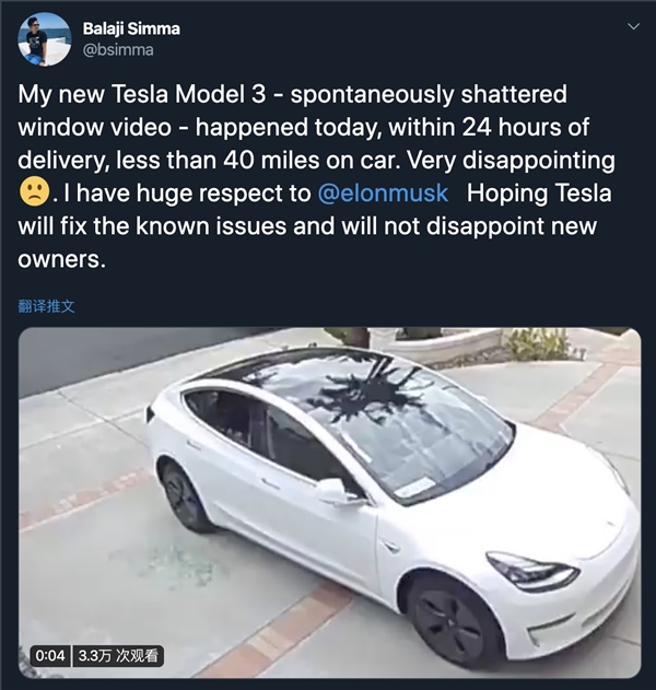 近日,一位名叫Balaji Simma海外网友在社交媒体上爆料称,自己刚买的特斯拉Model 3车窗自行破碎。据悉,该车驶里程不到40英里(约 64.3 公里 ),交付时间还未到 24 小时,网友表示十分无奈,并社交媒体上@特斯拉CEO马斯克,希望他能够解决该问题。