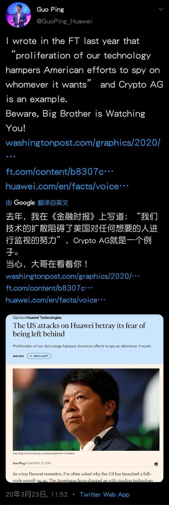 华为轮值董事长郭平今天开了推号,第一条推文提到他去年发表在金融时报的文章和前段时间曝光的美德利用瑞士加密公司Crypto AG监控世界几十年的丑闻。郭平说:“去年,我在《金融时报》上写到:‘我们的技术妨碍了美国随心所欲地进行监听的努力’,Crypto AG就是一个例子。当心,大哥在看着你!”