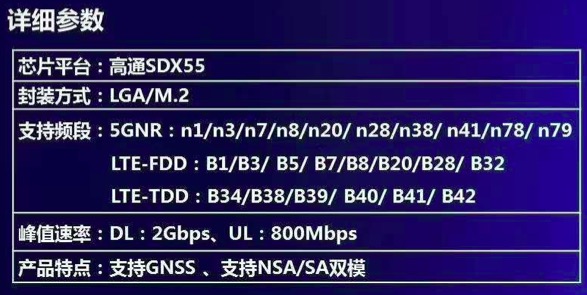 CU-QG1/CU-QM1是中国联通首款基于高通SDX55平台开发的面向消费市场/行业市场的5G模组,支持5G NR/LTE-TDD/LTE-FDD/HSPA+通信模式,支持NSA/SA,集成eSIM,并提供稳定的GNSS定位服务。