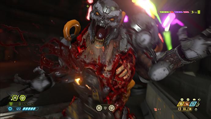 这种体验听起来一团乱,但《永恒》的战斗是有迹可循的,弹药,健康值和装甲掉落是根据色彩决定的,交错的敌人是闪光蓝色,然后当你在攻击距离内就会变成橙色。只要适应重金属音轨,游戏里的音乐同样可以读懂,你就可以通过听音来了解战斗进度。