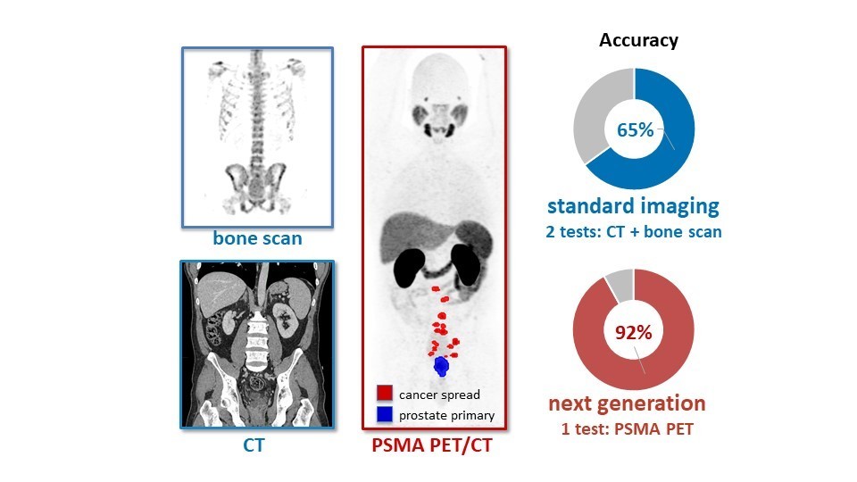 传统的前列腺癌成像包括对骨和CT扫描的结合,而新技术利用了两种不同类型的成像,即CT和PET。患者被给予一种叫做前列腺特异性膜抗原(PSMA)的分子,它可以在PET扫描下激活任何循环的前列腺癌细胞,而CT扫描可以提供详细的身体结构数据。因此,当把这两种成像技术结合在一起之后可以提供人体前列腺癌细胞可能存在位置的详细图像。