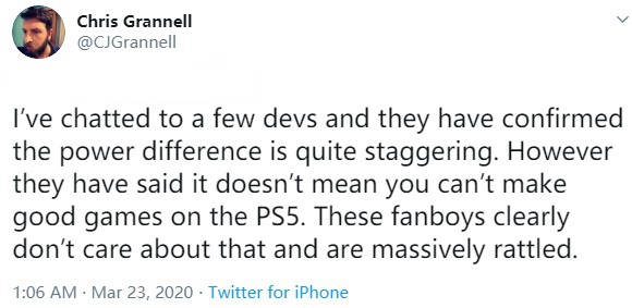 据前索尼游戏设计师CHRISS Grannel(设计过《杀戮地带2》)在推特上发布的评论,他说:“我已经和一些(PS5)开发人员交流了一下,他们已经证实了(PS5和Xbox Series X)性能的差异是相当惊人的。 然而,他们说这并不意味着你不能在PS5上打造出好的游戏。 而索尼的粉丝们显然并没有想到这些,他们显得惊慌失措。”
