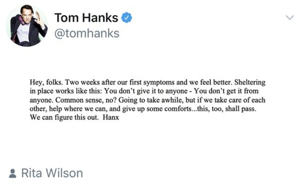 3月23日,在确诊了新冠病毒阳性近两周后,演员汤姆·汉克斯在社交网络平台再次发文和大家更新了自己的健康状况:“距离我们确诊已经两周时间了,我们现在感觉很好。”同时他还鼓励大家保持社交距离:“大家都待在原地不动,你不会把病毒传给他人,别人也不会把病毒传给你,这是一个常识不是吗?我们互相照顾,尽自己所能给予帮助,尽管生活中会有不便,但是我们终将会战胜病毒。”