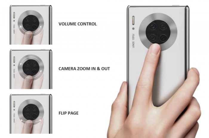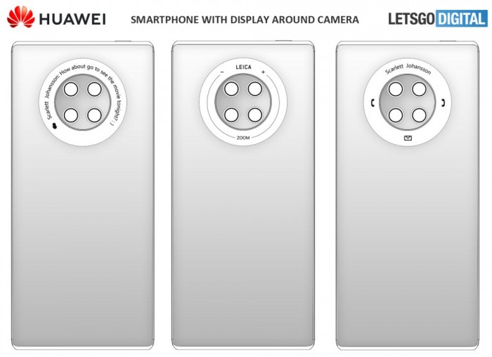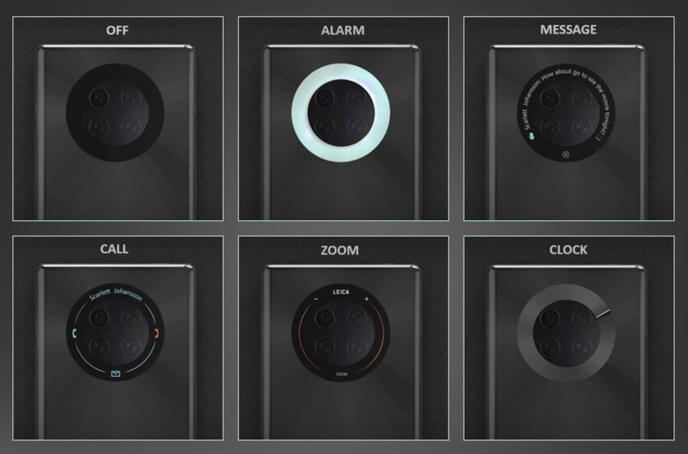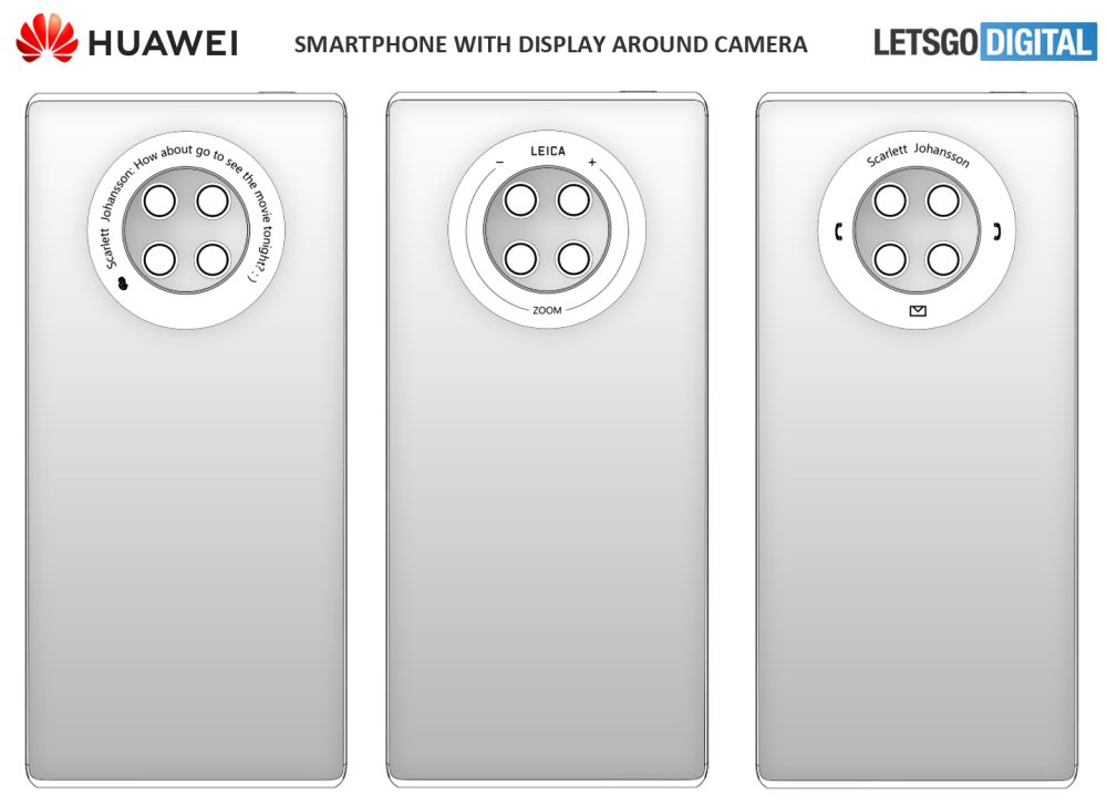 华为已经获批了一项非常优秀的设计专利,展示了拥有四个摄像头系统的华为Mate系列手机。而专利最大的亮点在于全新的交互方式,在圆形相机周围会有一个环状触控屏幕,不仅能用于显示时间、闹钟、信息、通话,而且还能够实现音量调整、相机焦距调整、翻页等操作。