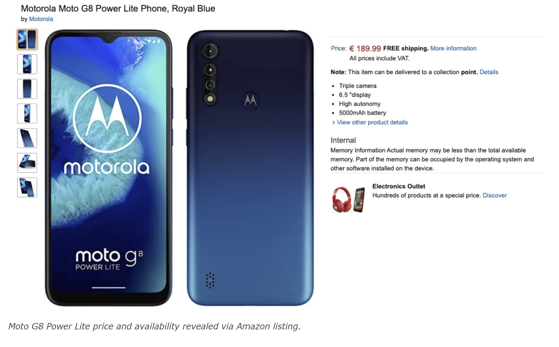Moto G8 Power Lite发布似乎已经迫在眉睫,因为它再次在网上曝光。这款手机出现在基准测试平台数据库、认证网站和谷歌play列表上之后,现在已经出现在意大利亚马逊网站上。相关网页显示了Moto G8 Power Lite的价格,上市日期和一些规格。