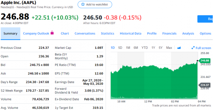 今天常规交易中,苹果股价上涨22.51美元,涨幅为10.03%,报收于246.88美元,市值再次超过1万亿美元。星期一,苹果市值自去年9月份以来首次跌破1万亿美元。星期二美股收盘后,苹果市值为1.08万亿美元,成为按市值计算仅次于微软(1.13万亿美元)的第二大美国公司。毋庸置疑的是,苹果受到疫情很大影响。逾1个多月前,苹果发布业绩预警称3月份季度营收将低于预期。目前,虽然中国境内生产恢复正常,专卖店重新开业,但疫情在中国之外地区的快速传播,对苹果产品需求影响很大,尤其是iPhone。苹果已关闭中国市场之外的所有专卖店,美国移动运营商也关闭了许多营业厅。星期二,Piper Sandler分析师哈什·库马(Harsh Kumar)发布投资报告,将苹果目标股价由343美元下调至260美元,但维持“增持”评级。他还下调了2020和2021财年苹果每股收益预期。库马还指出,巨额现金储备是苹果的一大优势,“目前,我们更看好拥有巨额现金储备和能产生稳定自由现金流的公司。苹果是这方面最强大的公司之一,持有逾1000亿美元现金,过去12个月产生的自由现金流接近640亿美元”。