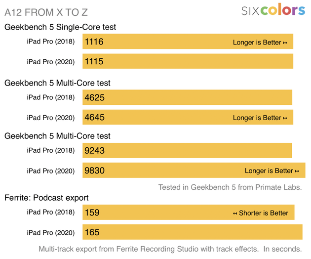 Six Colors(专门更新苹果新闻的个人网站)的观点是,新的2020款iPad Pro是向前迈出的一小步,他使用Geekbench 5给新旧两款iPad Pro跑了分,单核和多核测试的分数相差不大,而新iPad Pro的图形分数略有提高。
