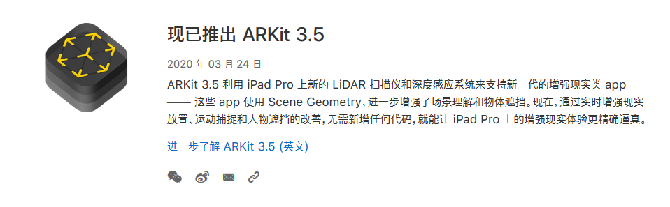 在官方支持页面中写道:“ARKit 3.5 利用 iPad Pro 上新的 LiDAR 扫描仪和深度感应系统来支持新一代的增强现实类 app —— 这些 app 使用 Scene Geometry,进一步增强了场景理解和物体遮挡。现在,通过实时增强现实放置、运动捕捉和人物遮挡的改善,无需新增任何代码,就能让 iPad Pro 上的增强现实体验更精确逼真。”