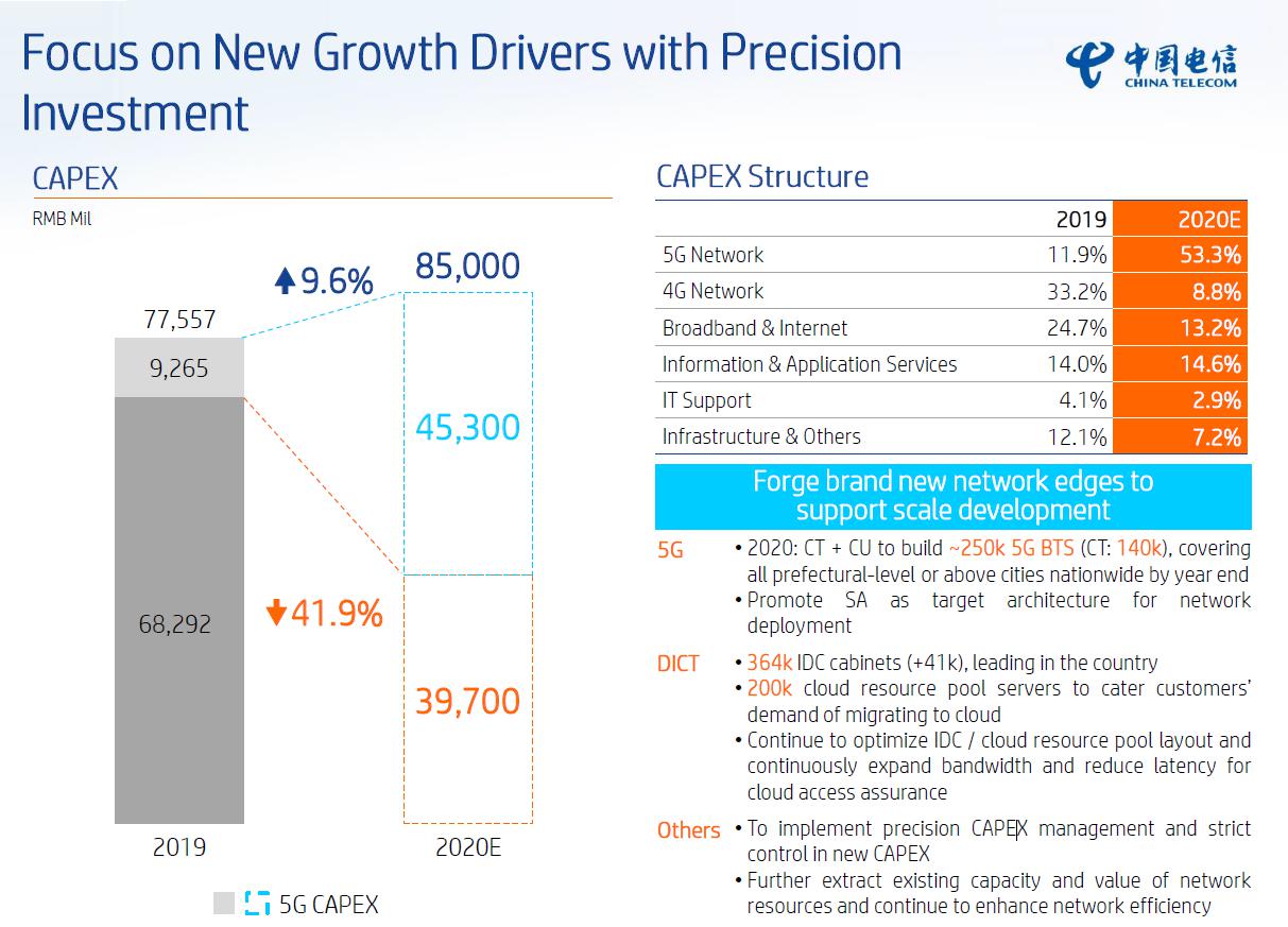 2019中国电信的资本开支为人民币775.6亿元,5G投资人民币93亿元;2020年资本开支约850亿元,其中5G资本开支约453亿元,占总资本开支的55.3%。宽带网络和信息应用服务成为高于4G开支的重要组成部分。