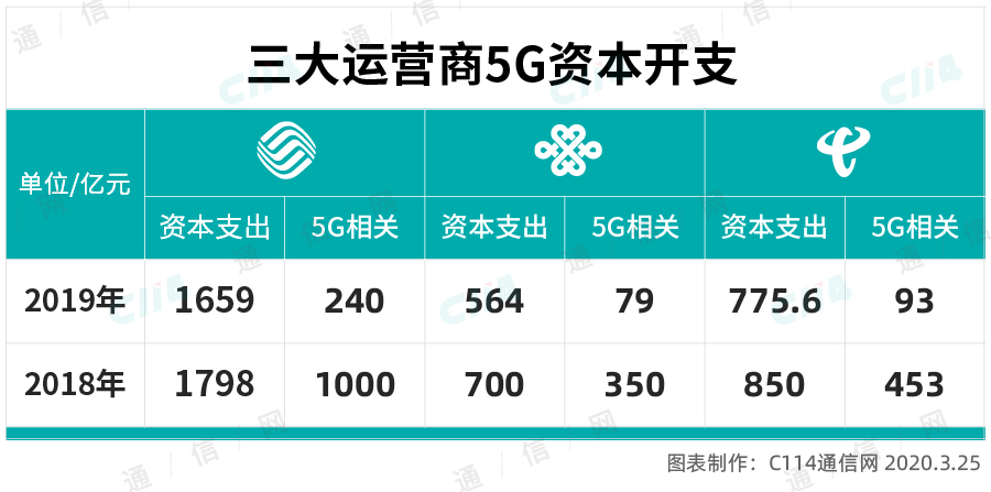 随着三大运营商先后发布2019年年度业绩,相关资本开支情况也逐渐明朗。 据C114统计,2020年,三大运营商的资本开支预算合计3348亿元,同比增长11.65%,与5G相关的资本开支预算为1803亿元,同比增幅高达338%,十分可观。