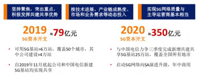 2019年中国联通总体资本开支为564亿元,其中含5G开支约79亿元;预计2020年资本开支约700亿元,其中5G开支约350亿元,占总资本开支的50%。主要用于三个方面:与电信高效建设5G网络;对于有良好模式的2B需求,按需滚动安排;完善LTE900底层网,原则上停止其他4G及非生产急需的建设。