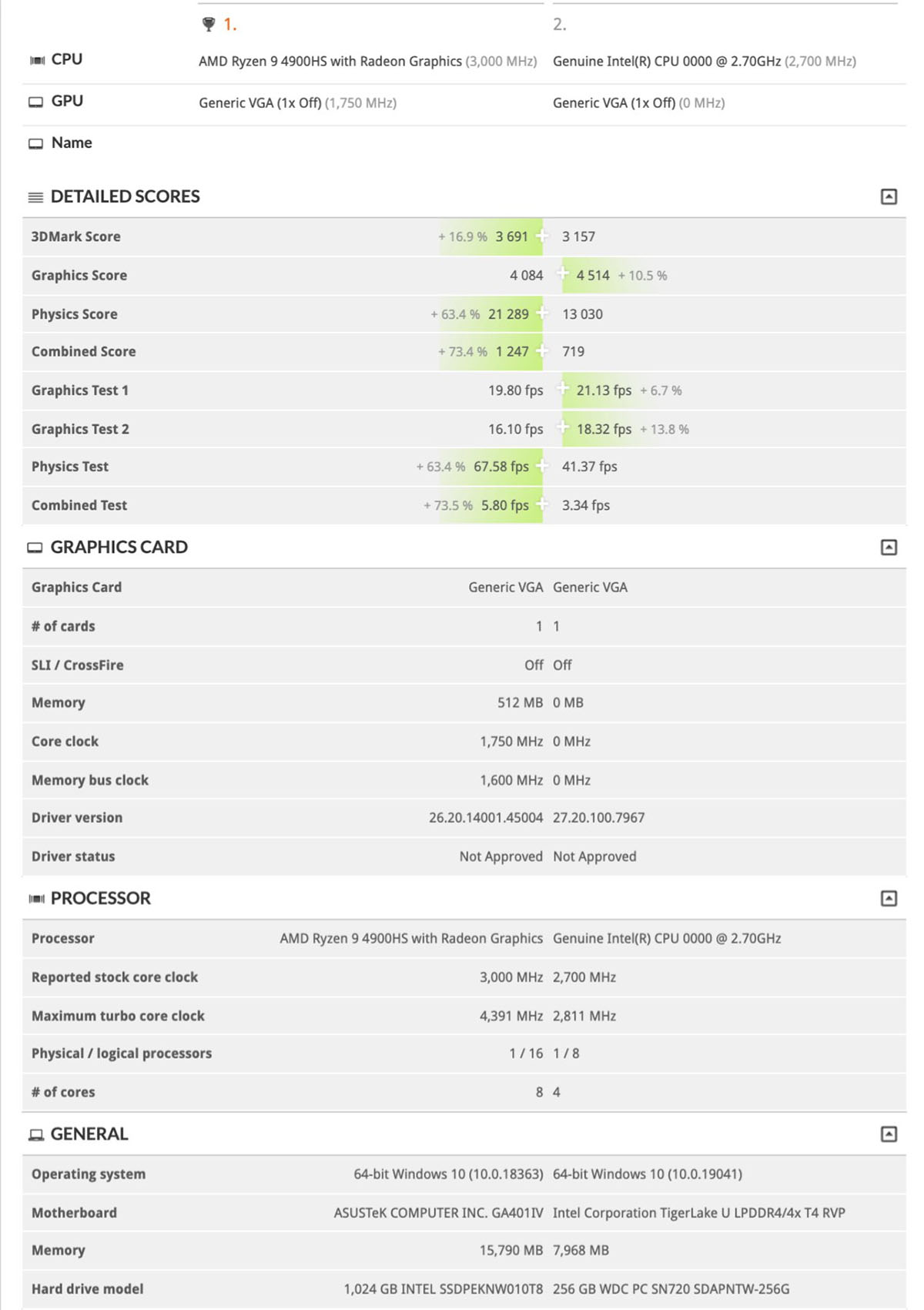 它找了35W的Ryzen 9 4900HS来对比,这台参照物使用的是16GB DDR4-3200内存,CPU测试Ryzen 9 4900HS比Tiger Lake-U快64%,毕竟核心数量碾压,但显卡性能Tiger Lake的Xe核显比AMD的Vega核心快了10%,Ryzen 9 4900HS使用的是Vega 8核显,拥有8组CU,512个流处理器,核心频率1750MHz。