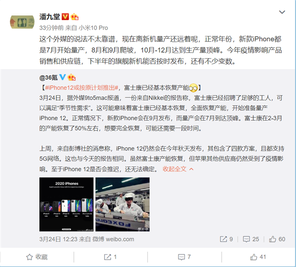 对此小米产业投资部合伙人潘九堂提出异议,表示这个外媒说法不太靠谱,现在离新机量产还远,正常年份iPhone都是7月份开始量产,8月、9月爬坡,10元-12月达到生产量顶峰。今年疫情影响产品销售和供应链,下半年的旗舰机能否按时发布还存在不少变数。