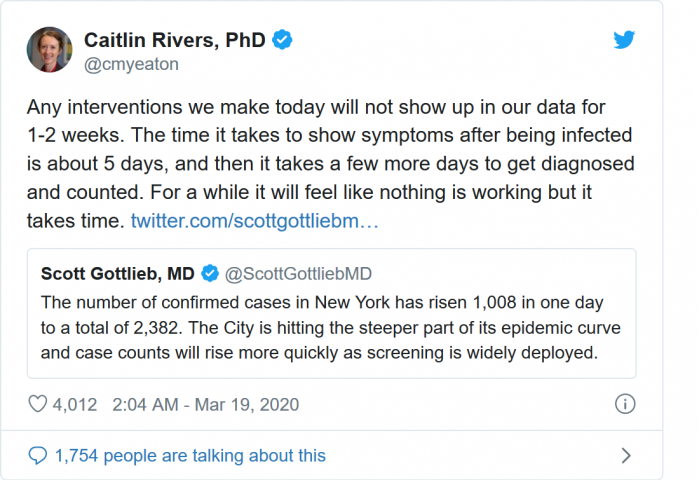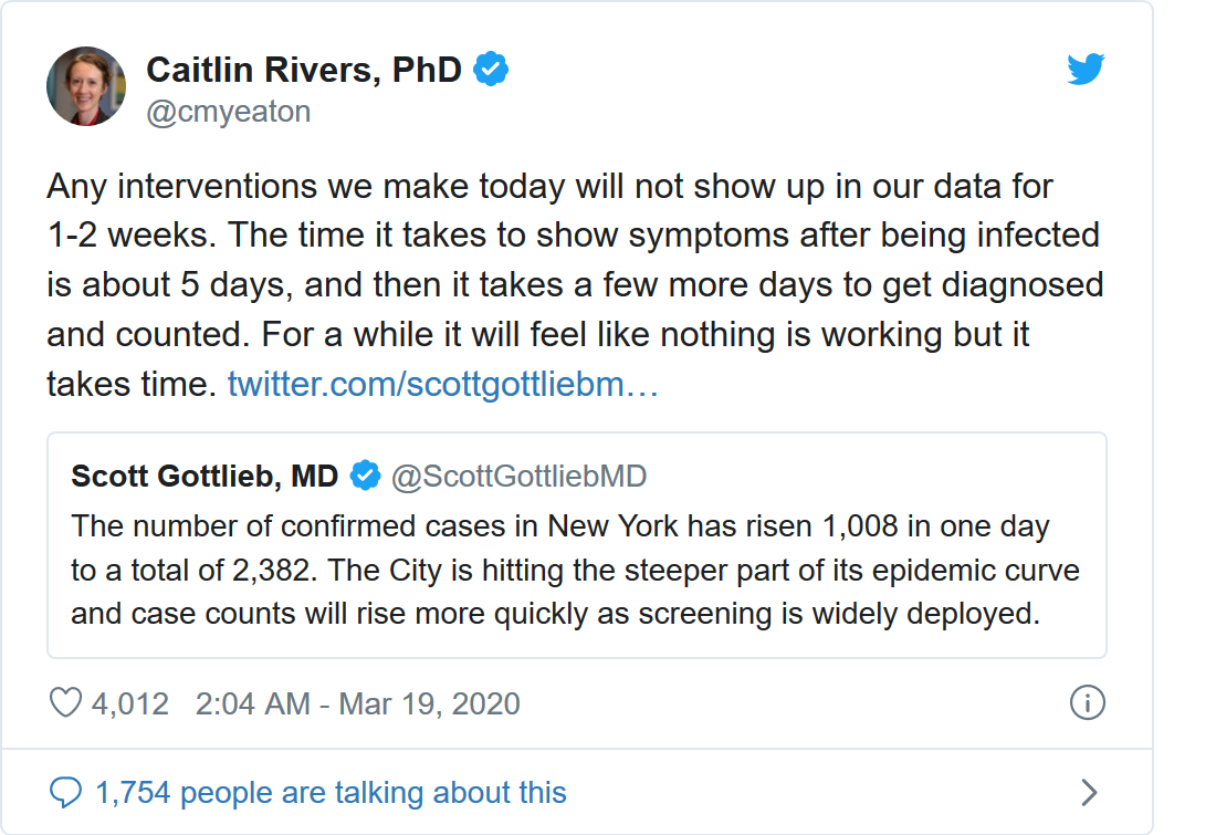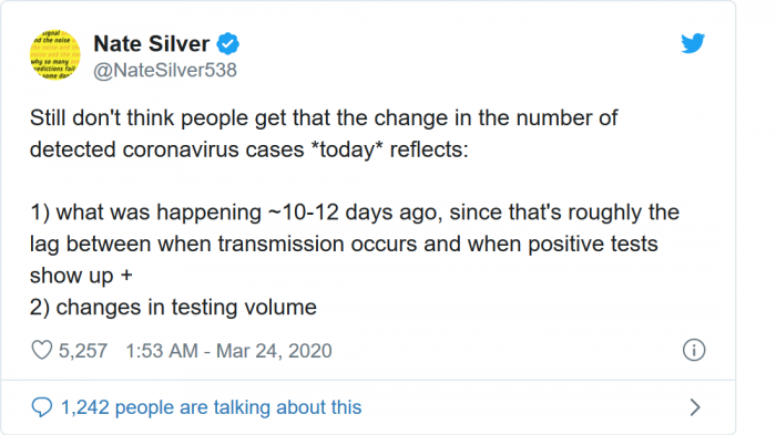 今日(3月24日)的数字--超46000例确诊病例及近600例死亡--实际上反映的是美国大约两周前的情况。这是由多种因素造成的,包括这种致命病毒的症状在几天内不会出现。