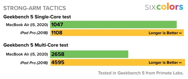 对于这样的对比,一些网友也是表示,A12Z/A12X跑分都比MacBook Air强。不过也有指出,MacBook Air跑出来的成绩还有主动散热风扇,A12X/A12Z可没有。