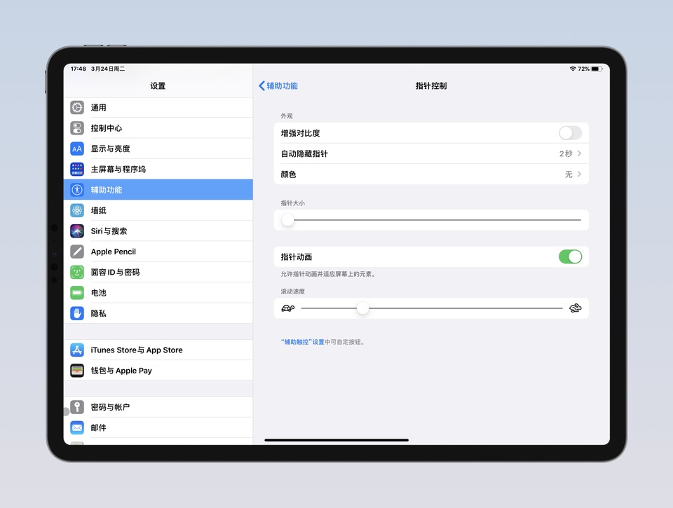 值得一提的是,关于鼠标的自定义调整,可以在“设置 > 辅助功能 > 指针控制”中进行设置,例如调整光标自动隐藏时间、光标大小、指针动画、指针滑动速度。
