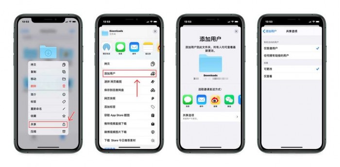 在文件 app 中的“iCloud Drive”中选中需要共享的文件夹,然后在弹出的二级页面中选择“添加用户”,并向想共享的用户发送邀请即可将 TA 加入到文件夹的成员列表当中,发起者还可以设置文件夹的共享选项,例如调整有权访问的用户、设置用户权限。
