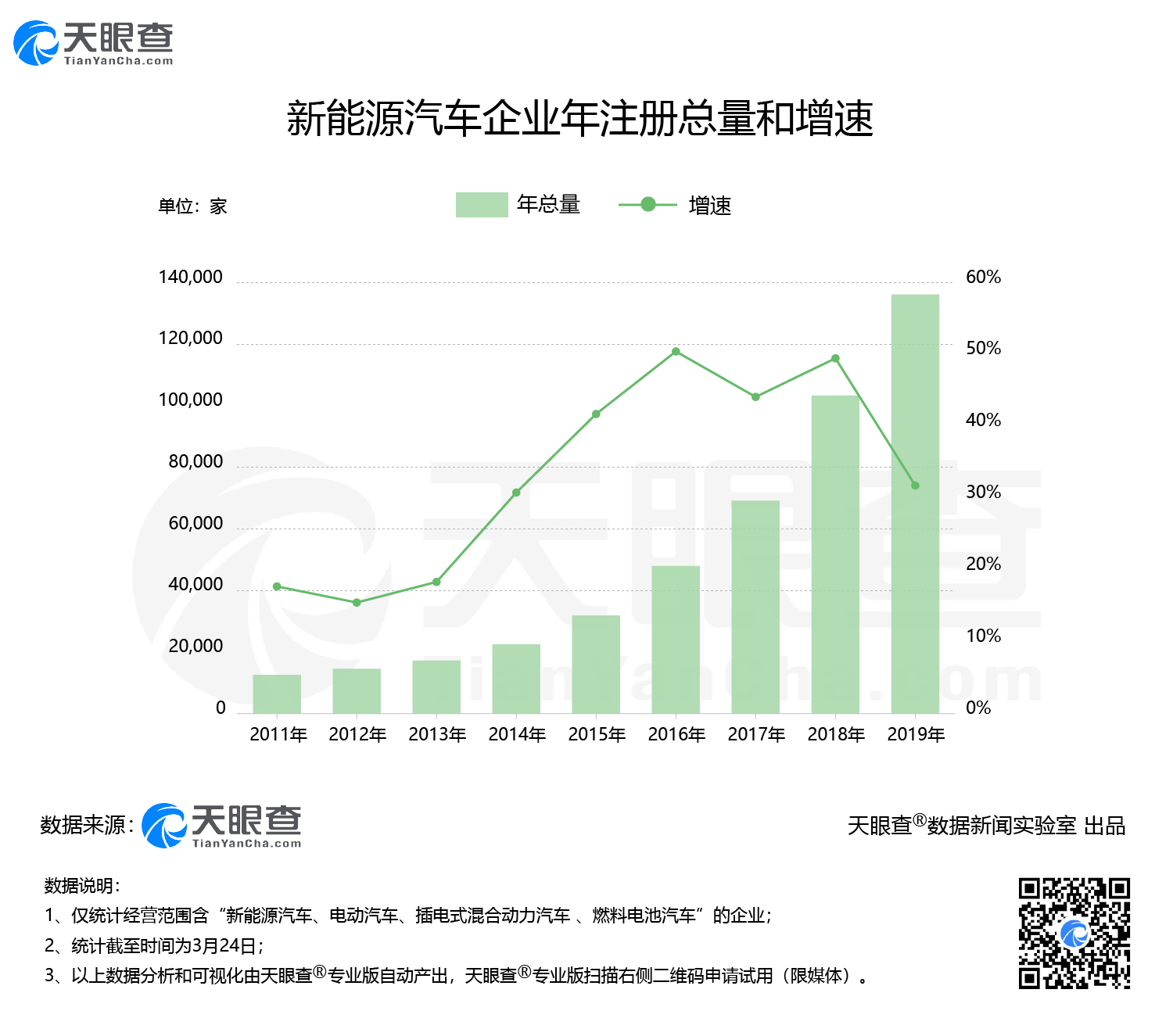 天眼查专业版数据显示,我国目前经营范围含“新能源汽车、电动汽车、插电式混合动力汽车、燃料电池汽车”的企业(以下简称“新能源汽车企业”)超过14万家。新能源汽车企业自2012年起保持稳定增长,2016增速到达高峰,为50.43%,之后略有波动,2018年再次攀升至次高点,全年新增新能源汽车企业超3.4万家,为历史新增最多年份,2019年增速下降至31.76%。