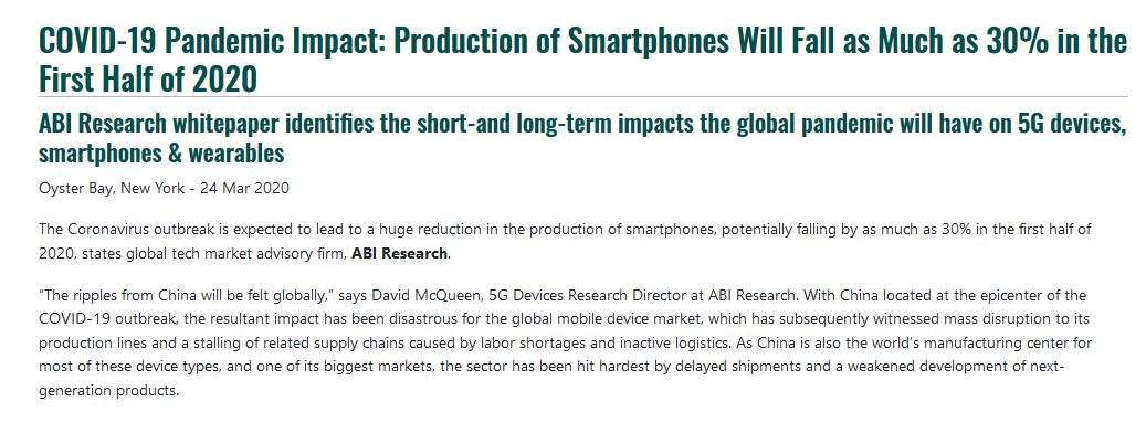 据国外媒体报道,来自市场研究公司ABI Research的研究报告预测称,“停滞的供应”加上“瘫痪的需求”,将导致全球上半年智能手机产量下降30%。报告表示,Covid-19疫情在中国的爆发,对全球移动设备市场造成了至关重要的影响,随后,由于劳动力短缺和受到影响的物流,全球移动设备市场出现了生产大规模中断和相关供应链的停滞。