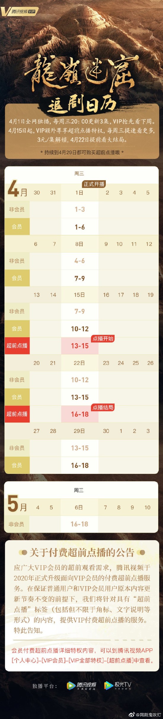 《鬼吹灯之龙岭迷窟》将于每周三20点更新3集,VIP抢先看下周。4月15日起,VIP额外尊享超前点播特权,每周三提速看。