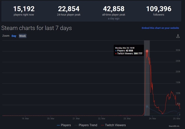 《Half-Life:艾莉克斯》首发当日在Twitch直播平台吸引了30万围观群众,不仅秒杀老牌直播霸主《Fortnite》(11.8万),甚至超越了当下最火的吃鸡游戏《使命召唤:战区》(29.6万)。
