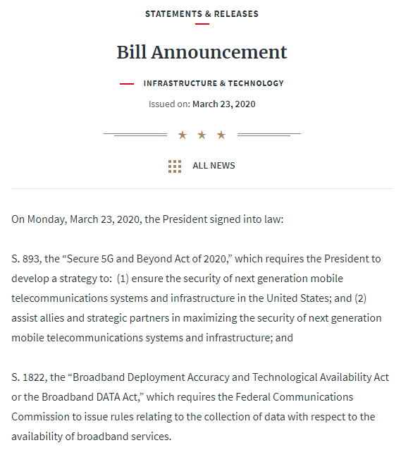 国会在一份声明中称:“总统今日签署通过的法律,对确保所有美国人能够访问宽带、以及网络的安全和可信赖至关重要。鉴于当前无数民众因受到疫情影响而采取居家隔离的线上学习和远程办公,这无疑对互联网提出了更高的需求”。
