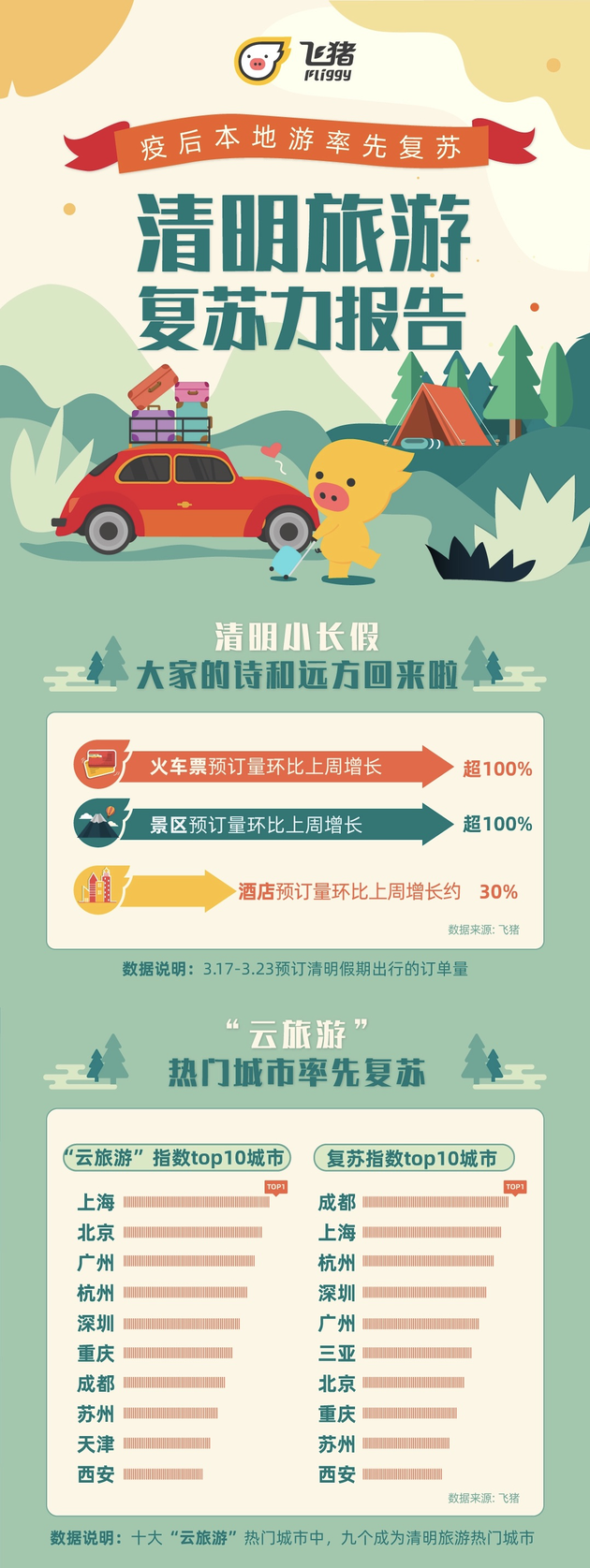 飞猪数据显示,3月17日至23日期间,清明假期火车票和景区的预订量环比1周前增长超100%,多数预订为省内车段,酒店预订量环比增长约30%。