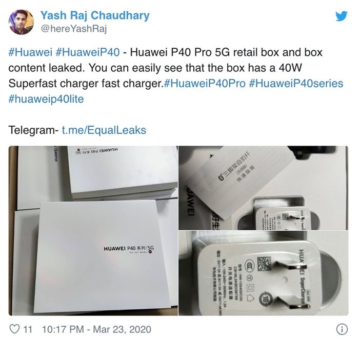 随着3月26日华为P40系列全球线上发布会到来,曝光消息也随即增多。近日,推特网友Yash Raj Chaudhary爆出了华为P40系列礼盒的照片。从泄露的照片可以看到,礼盒含有蓝牙版三脚架自拍杆与一个快充充电头,最大支持10V/4A 40W的输出功率。