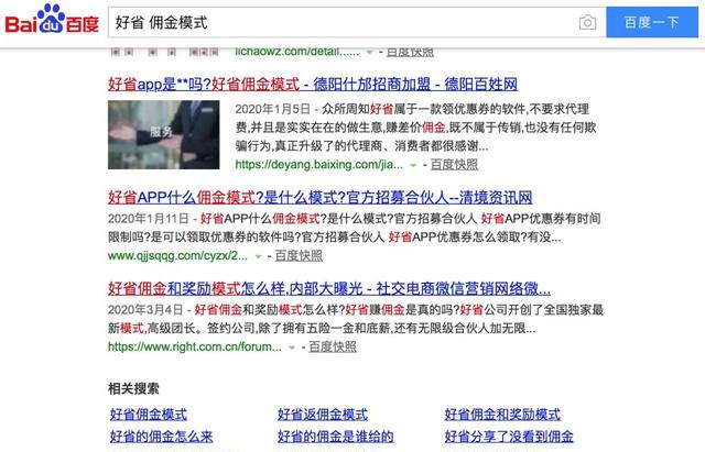 上面搜索 “ 好省 佣金模式 ”,搜索结果里的德阳百姓网、清境资讯网,也都混杂了未经核实的信息。
