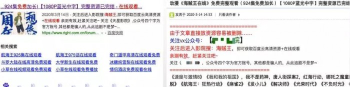 比如我想在线看《 海贼王 》动画,百度搜 “ 航海王 免费 在线观看 ”,往往在首页就能遇到给公众号导流的垃圾信息。