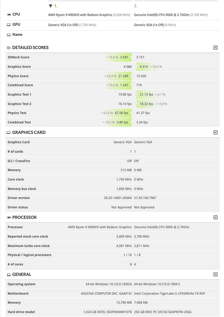 有网友拿它和数据库中的锐龙9 4900HS对比,CPU(物理分数)差异较多,毕竟4900HS是8核。不过,集成的GPU方面居然是Intel核显棋高一招,领先Vega8幅度有10%。