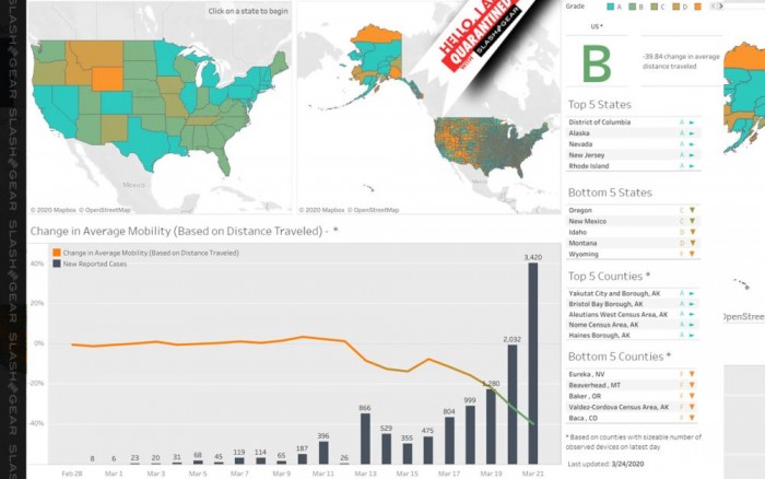 该评分排行榜的末端,则是民众移动距离过去相差不多的州,怀俄明州拿到最差评分F,因为民众平均移动距离减少不到10%,蒙大拿州,爱达荷州评分为D ,新墨西哥州及俄勒冈州评分则为C。Unacast指出,如果以全美民众来看,整体评分则为B,美国人平均出行距离减少了32%。
