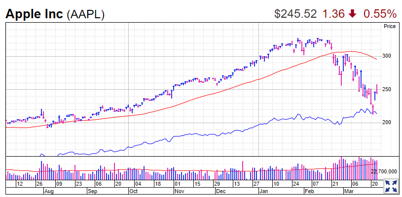 在股票评级得到一名华尔街分析师上调后,苹果股价上涨到一个关键支撑价位上方。德意志银行分析师杰里尔·昂格(Jeriel Ong)星期三发表投资报告,将苹果股票评级由“持有”上调至“买进”,但因股市调整原因将目标股价由295美元下调至270美元。早盘苹果股价涨幅一度达到4.8%,收盘时下跌1.36美元,跌幅为0.55%,报收于245.52美元。早盘,苹果股价上涨至200日均线上方,收复40周均线,但收盘时跌到这两条线下方。另外,当前苹果股价远低于50日和10周均线。昂格说,当市场稳定时,iPhone、AirPods、服务和毛利率的变化将是推动苹果股价上涨的四大引擎。今年秋季发布的5G iPhone,将会引发升级潮;苹果还将受益于不断增长的服务业务。但昂格指出,苹果股价也面临一些风险。因疫情关闭专卖店,使苹果近期面临业务中断的风险。9to5Mac刊文称,苹果预计将在4月份逐步恢复专卖店营业;苹果仍然面临供应链中断问题;消费者购买新产品的热情会降低,尤其是在疫情导致经济衰退的情况下。