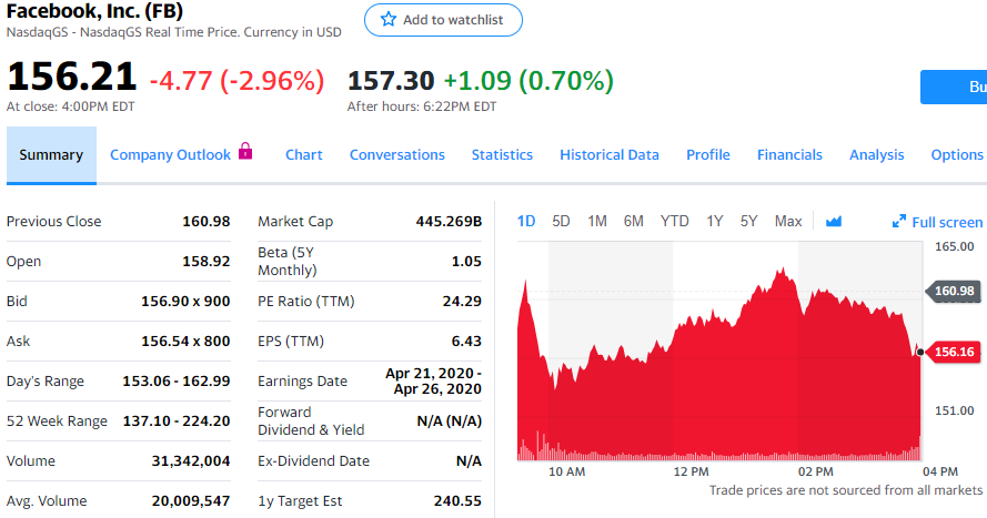 今天常规交易中,脸书股价下跌4.77美元,跌幅为2.96%,报收于156.21美元。星期二收盘后,脸书发表博文称,受疫情严重影响市场的广告销售出现疲软迹象,这促使数名华尔街分析师下调了其目标股价。脸书副总裁亚历克斯·舒尔茨(Alex Schultz)在博文中称,在受疫情影响最严重的许多市场,Messenger发送的消息量环比上个月增长逾50%,音频和视频通话量增长逾1倍。一周内Instagram和Facebook Live的直播视频观看量翻了一番。自疫情开始以来,脸书应用在意大利的使用时长增长了70%。FBN Securities分析师舍布利·塞拉菲(Shebly Seyrafi)将脸书目标股价由245美元下调至220美元,但维持“跑赢大盘”评级。Cowen分析师约翰·布莱克利奇(John Blackledge)将脸书目标股价由240美元下调至215美元,维持“跑赢大盘”评级。Monness Crespi Hardt分析师布莱恩·怀特(Brian White)对脸书股票评级为“买入”,把目标股价由260美元下调至230美元。与1月29日224.2美元的高点相比,脸书股价累计下跌了约31%。