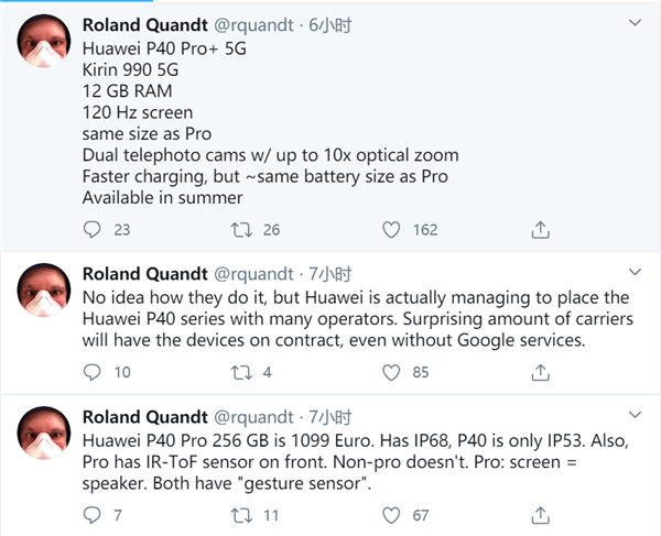 知名爆料人士Roland Quandt透露,华为P40 Pro 256GB版售价1099欧元(约合人民币8500元)。Roland Quandt透露,P40 Pro支持IP68级防尘防水,P40支持IP53级防尘防水。此外,P40 Pro前置拥有TOF镜头,P40则没有这颗镜头。