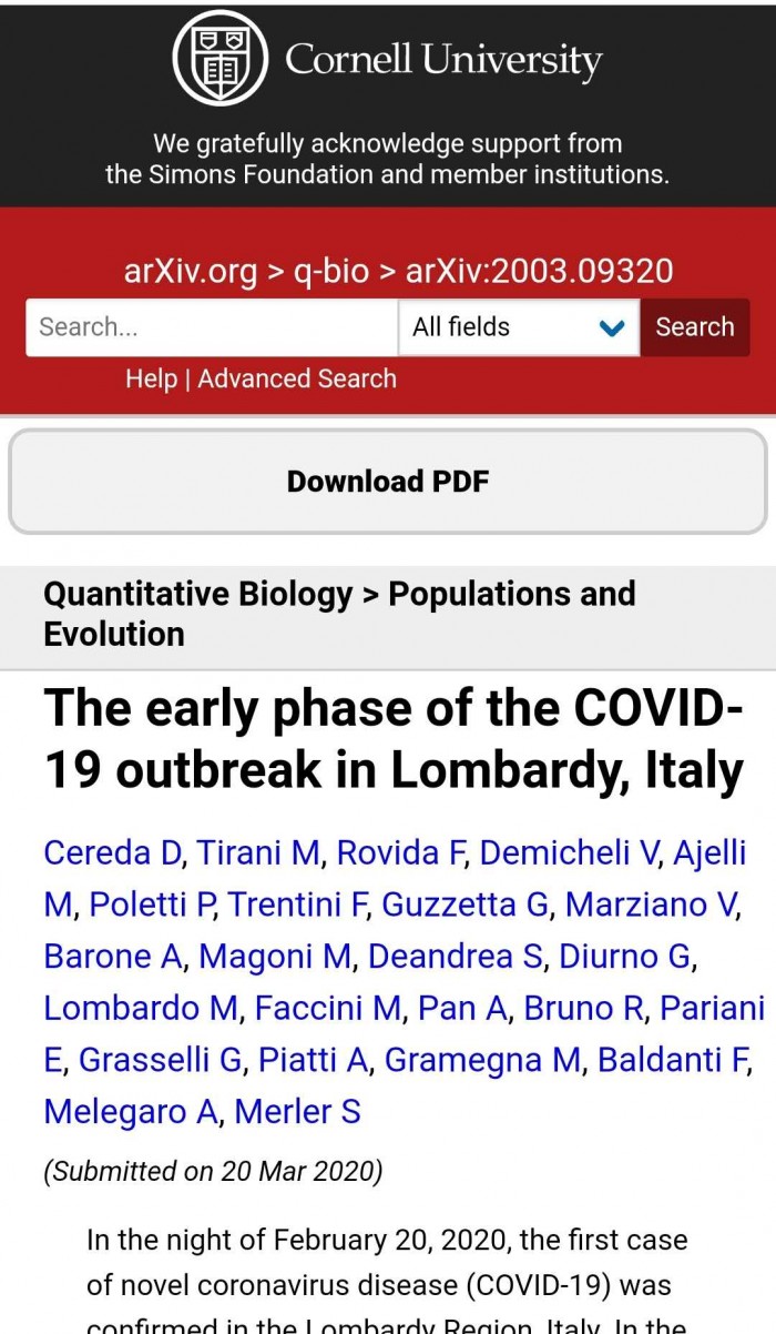 研究报告称在1号病人确诊前,病毒已经在伦巴第大区南部很多市镇传播。通过研究伦巴第大区的5830个确诊病例,研究人员向前追溯,构建出传染链条。从而得出结论,从1月1日-29日,在伦巴第大区有零星散发的病例,而从1月30日-2月19日,新发病例越来越多,仅2月18日一天就有60例之多。两天之后的20日,意大利1号病人被确诊。