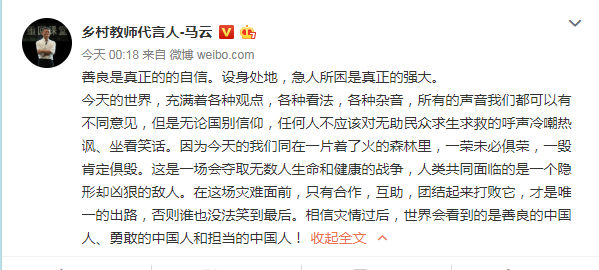 北京时间3月26日消息,马云今日凌晨发布微博称,在这场灾难面前,只有合作,互助,团结起来打败它,才是唯一的出路,否则谁也没法笑到最后。马云称,今天的世界,充满着各种观点,各种看法,各种杂音,所有的声音我们都可以有不同意见,但是无论国别信仰,任何人不应该对无助民众求生求救的呼声冷嘲热讽、坐看笑话。