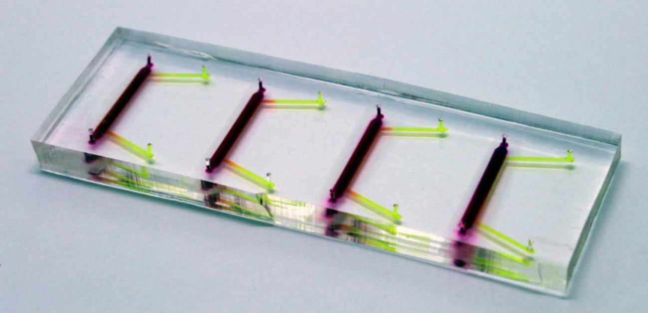 这种3D打印设备由四个上部和四个下部通道组成,这些通道由透明的聚酯多孔膜隔开。人角膜细胞在每个上部通道中孵育7天,在这段时间内它们会生长,在膜的顶部形成细胞的固体屏障。然后将流体泵送通过上腔室和下腔室,将压力施加在角膜组织层的两侧。这模拟了一种方式,在这种方式下,真实的角膜在一侧通过眼睑的眨眼和泪液的运动而受到压力,而在另一侧则通过眼内的流体受到压力。