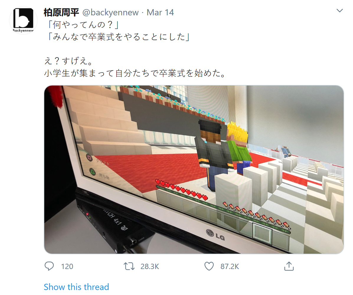 受疫情影响,世界各地的学校纷纷停课停学,很多学生错过了他们的开学典礼和毕业典礼。日前,日本一帮有创意的日本小学生们自发地联合起来进行了一场“云毕业”——在《我的世界》中创建了他们自己的虚拟毕业典礼。