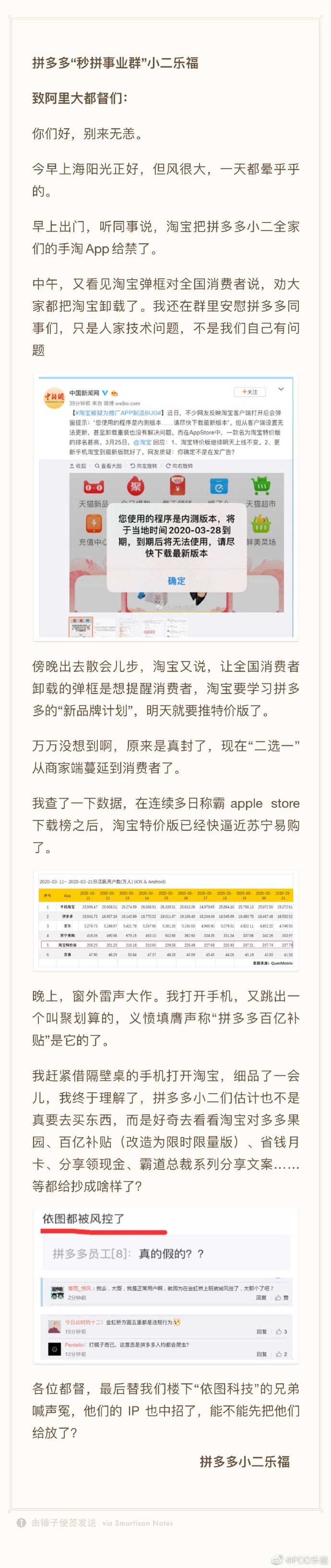 阿里回应“封拼多多员工淘宝账号”后,微博名为“PDD乐福”的拼多多“秒拼事业部”小二乐福“回怼”阿里称,淘宝把拼多多小二全家们的手淘App给禁了,连拼多多上海总部楼下的“依图科技”的IP也中招被风控了。
