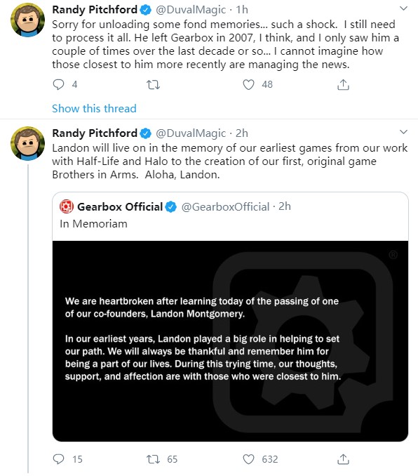 Gearbox 现任首席执行官 Randy 也在个人 Twitter 上回忆了与 Landon 共事的岁月,从《半衰期》、《光环》到他们的首个原创游戏《战火兄弟连》,Landon 的作品可以说影响到了非常多玩家,虽然在2007年 Landon 离开 Gearbox 后的时间里他们只见过寥寥数面,但心中的震惊与悲伤依旧难以言表。