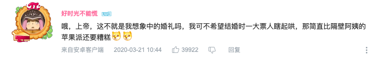 疫情下的“云婚礼”虽说迫于无奈,但也代表着年轻用户对“云上生活”的另一种全新尝试,受到无数B站直播网友的艳羡与点赞,纷纷表示“这不就是我想象中的婚礼吗”。