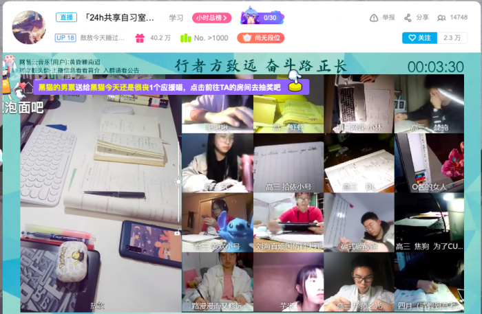 “24h共享自习室”、“18h高考自习室”便是其中的缩影。不管是凌晨1点,还是早上7点,学生们都在认真埋头学习。“行者方致远,奋斗路正长”作为直播间的座右铭挂在直播页面正上方,而直播界面右侧则是相互鼓励、问好、交流学习进度的互动留言版,数万名“云同桌”同时在线督促学习。