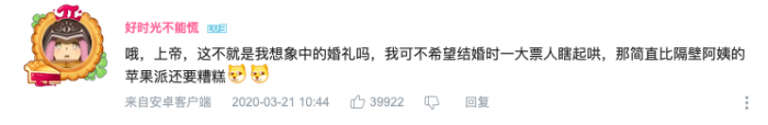 关于举办线上直播婚礼的初衷,刘文超表示,“通过这样的‘云婚礼’形式,希望给众多马上要结婚的新人提供一个参考,也算给防疫工作做一点点贡献。”
