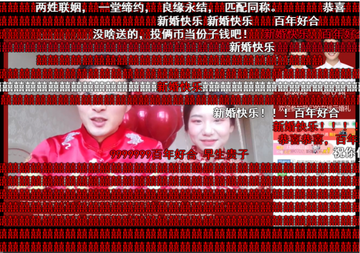 两位新人的“撒糖”行为,让网友们炸开了锅,“恭喜恭喜”、“百年好合”、“早生贵子”,来自全国各地的网友霸屏式弹幕祝福,排面十足,还有不少网友云送“份子钱”,300万“云伴郎伴娘”狂刷小礼物,为这对小夫妻的送去新婚祝福。