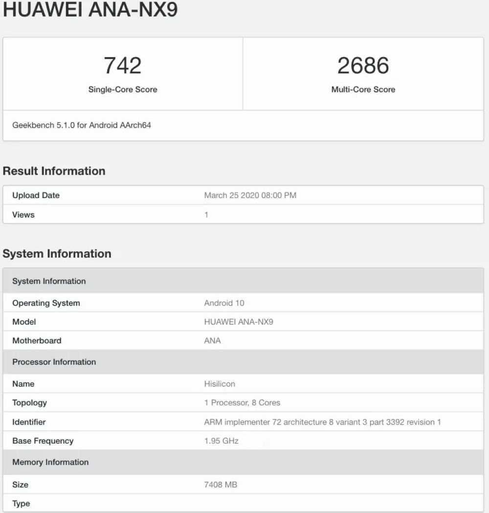 根据GeekBench跑分库的信息,华为P40出场搭载Android 10系统,搭载麒麟990 5G处理器,配8GB的内存。除了上述信息之外,跑分库中并没有提供其他有用的信息。不过根据此前的认证信息,华为P40支持22.5W的快充,而华为P40 Pro将具有40W快速充电。
