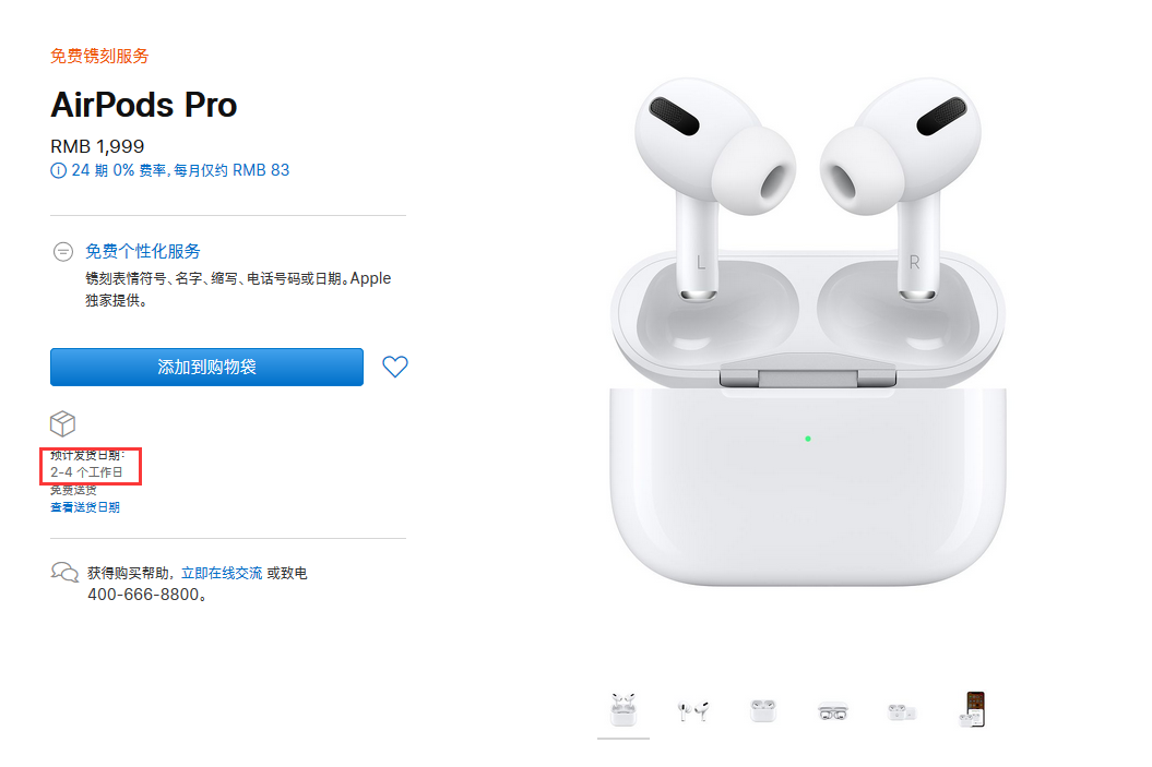 2019年的圣诞假期,苹果的AirPods Pro出现了一机难求的局面。苹果知名分析师郭明池(Ming-Chi Kuo)在今年1月表示苹果正增加供应以满足用户需求。而现在访问苹果官网,可以发现AirPods Pro的发货时间已缩短至 2-4个工作日,零售价格为1999元,而且支持24期免息分期,每月只需要83元。