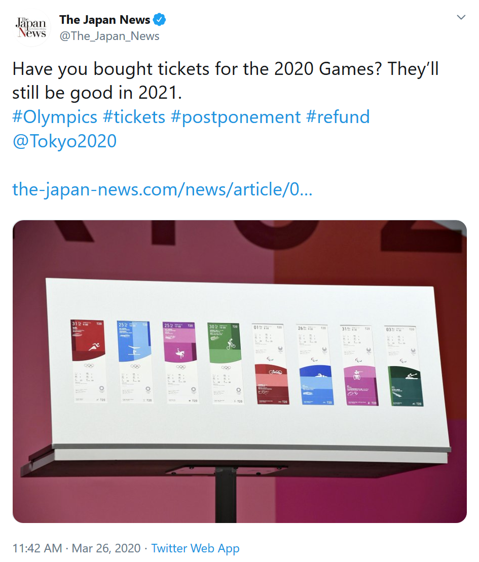 此外,马拉松项目由于比赛城市转移到日本北海道的首府札幌市进行,日本奥组委针对有退票意愿的观众,也采取了退票的措施。并且,受奥运会延期的影响,从4月起在东京都内设置的奥运门票店铺销售点的相关服务也被叫停。