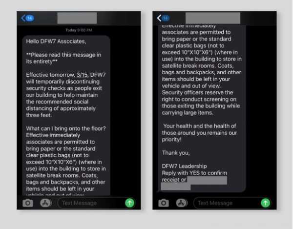 这一场景表明,员工在保护自己健康方面可谓“八仙过海,各显神通”,也表明亚马逊管理层在这方面没有给予他们必要的指导。非营利的员工权益保护机构联盟Athena向Fast Company提供了亚马逊发送给仓库员工的消息(发送时间是3月15日)的截屏,建议员工保持“约3英尺“的社交距离。
